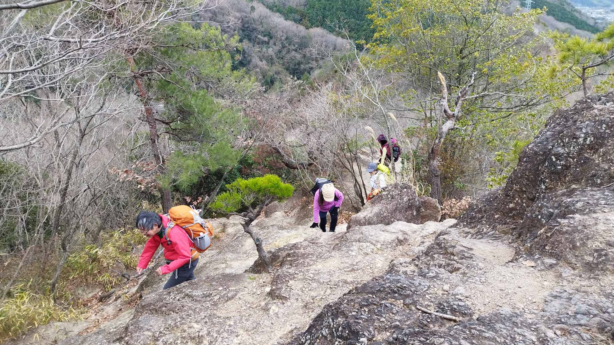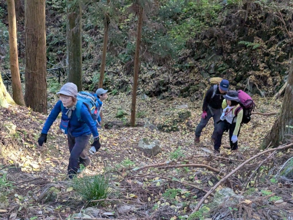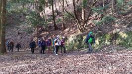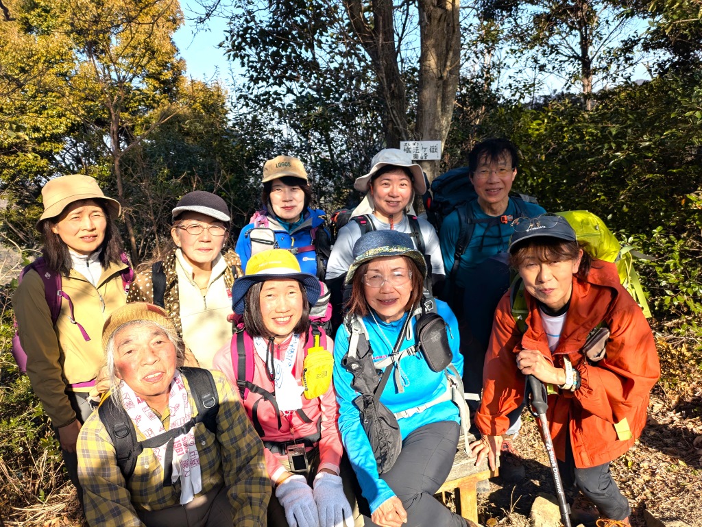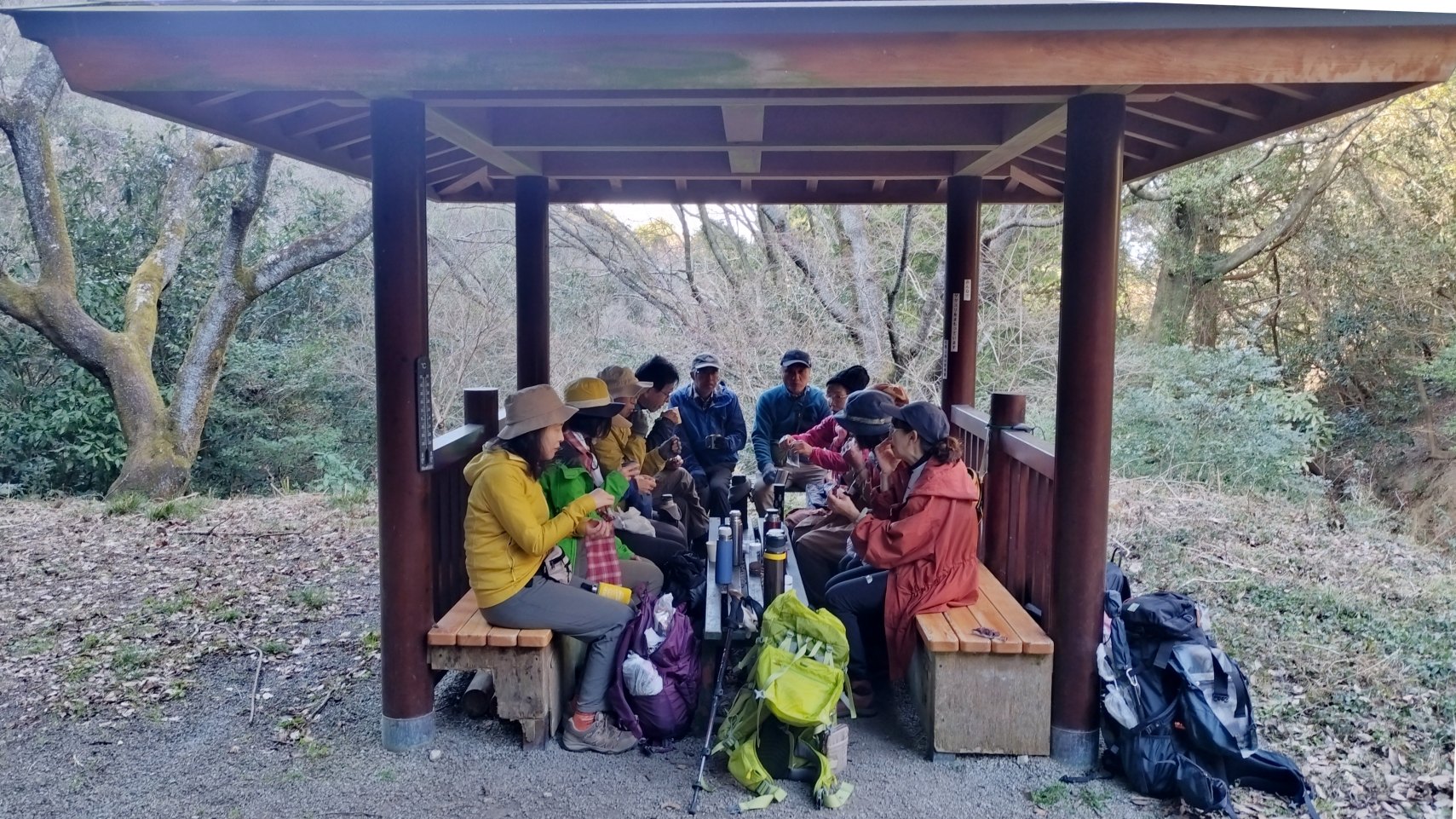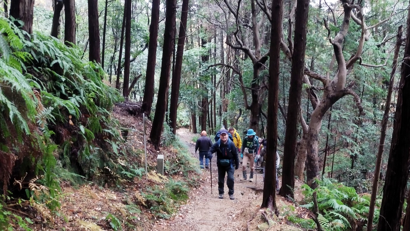 12月14日の雨山例会は、早朝は雨が降っっていましたが、M崎リーダーの読み通り、歩いている間は雨が降らず、昼過ぎからは晴れ間ものぞきました。メインの行先が、313mと低い山なので、簡単に登れると思っていましたが、途中で一回下りて登り返しがあったことと、段差の大きな階段が随所にあったことで、最高地点の標高の割に歩きごたえがありました。