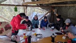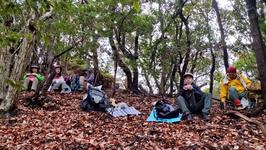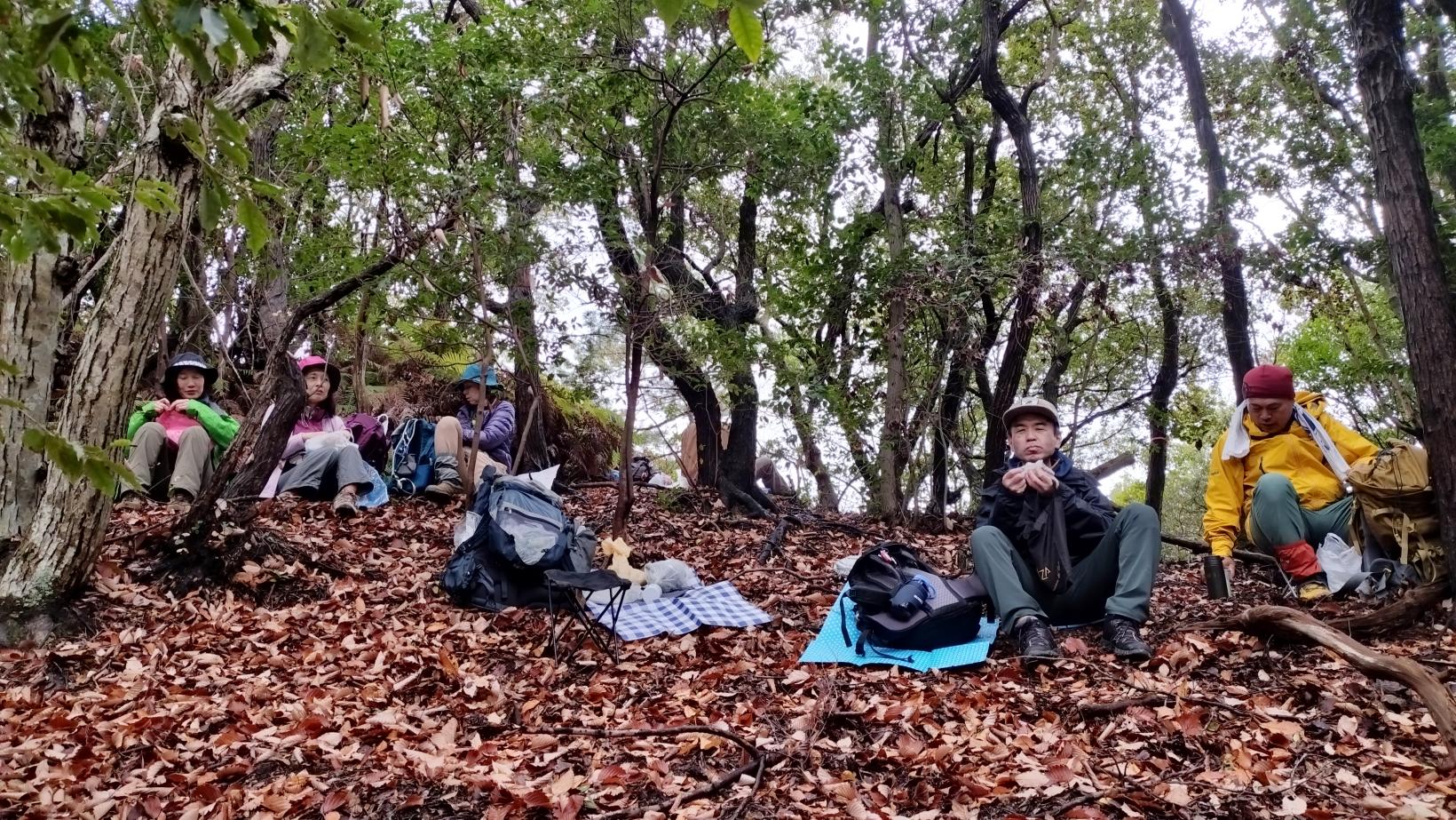 小ピークをつなぐ尾根は風があったため、小ピークから少し下った場所で風があまり吹かない場所で昼食としました。場所を選定されたM崎さんが「お昼には少し早いですが。」と言われた通り、11:45からの食事でした。