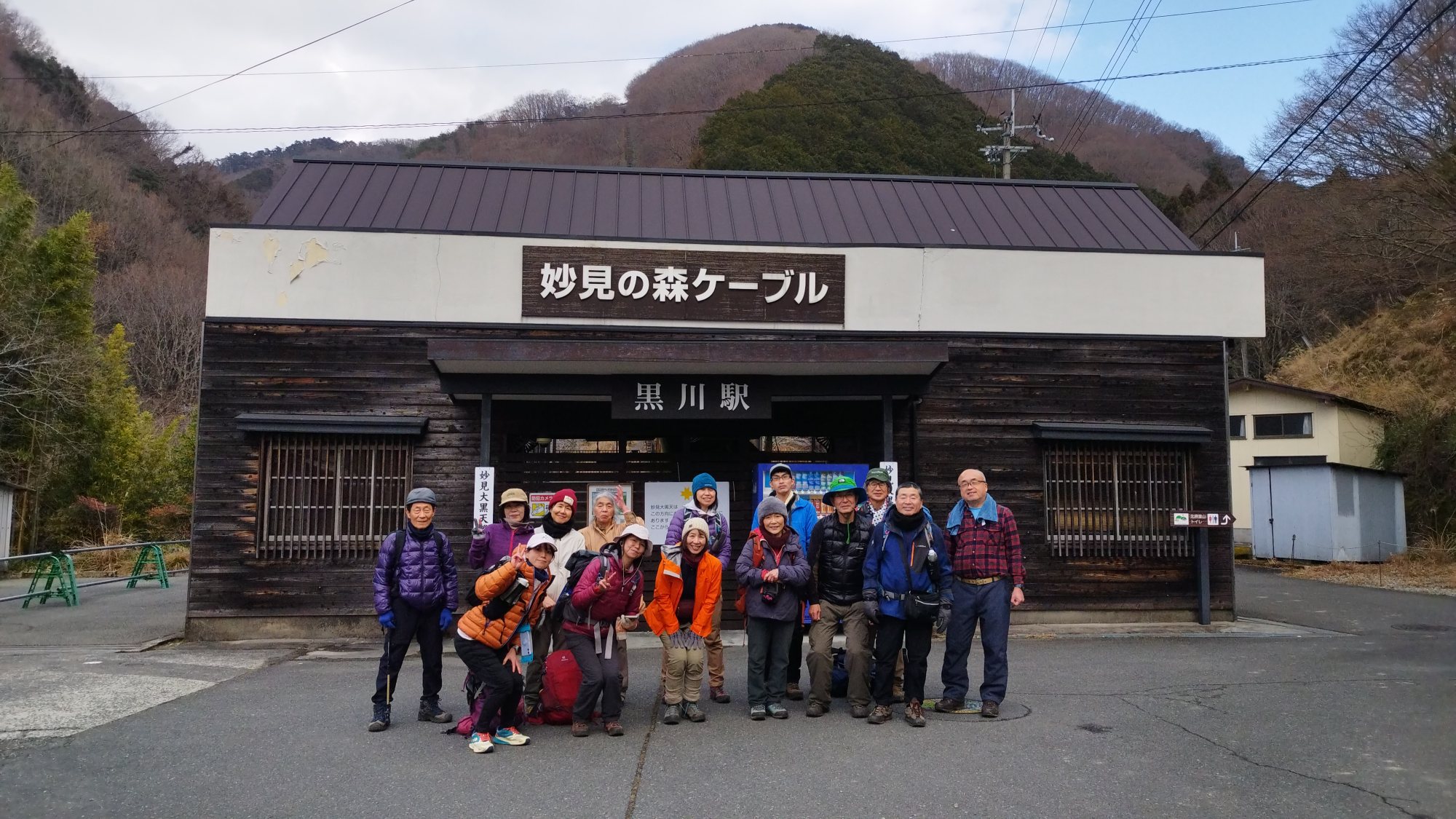 能勢電鉄の妙見口駅に連続して到着した2列車に乗られて15名の方が集まりました。