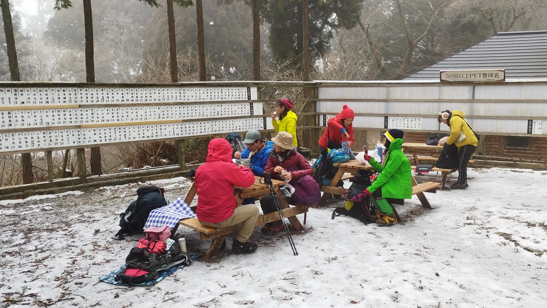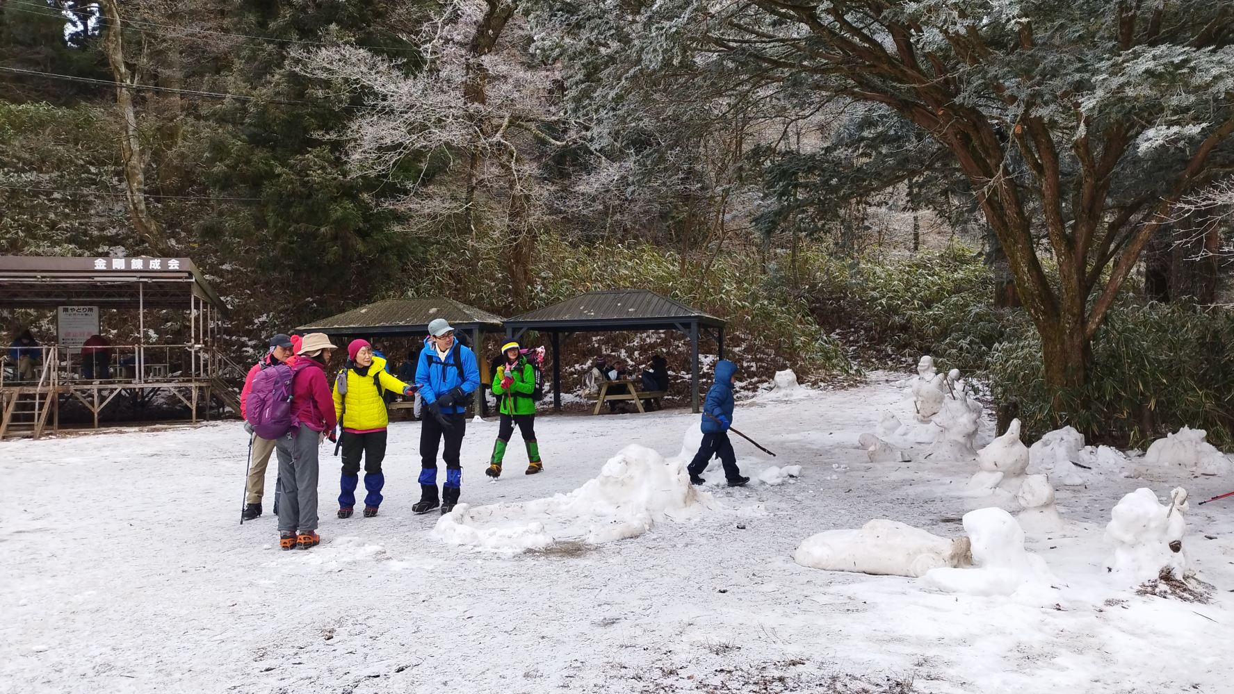 寒気の南下に伴い1月3日の愛宕山は雪が予想されます。登山者は多いのでルートに問題はありませんが、凍結して滑りやすくなっているかもしれませんので、寒さ対策に加え、念のためアイゼンをお持ち下さい。